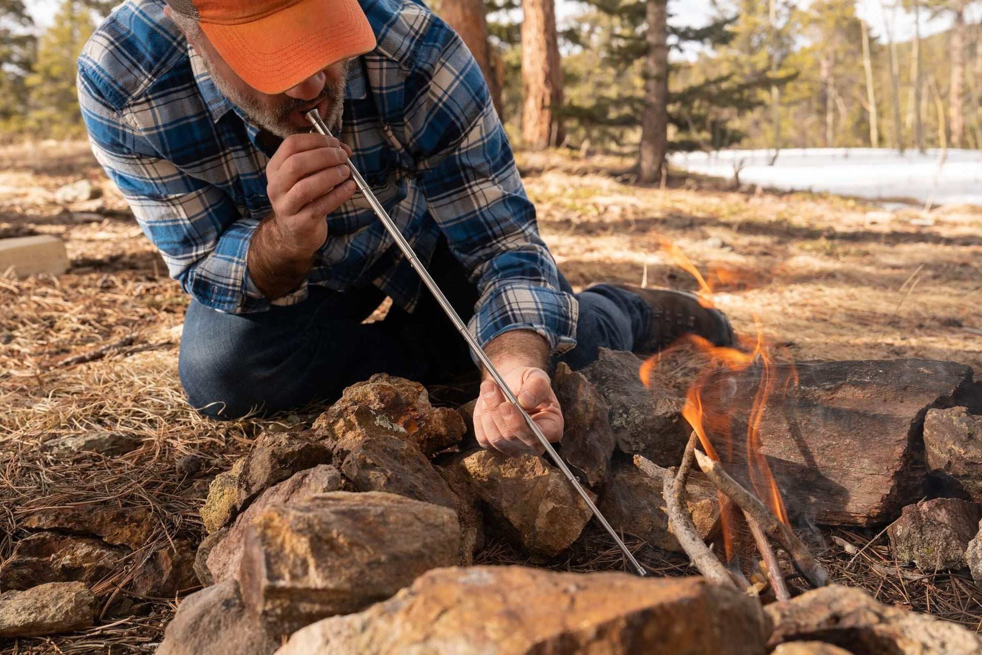 One single steady breath through the extendable bellows and it will stoke the embers to life, even with wet or snowy wood.
